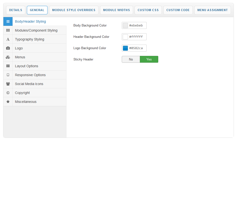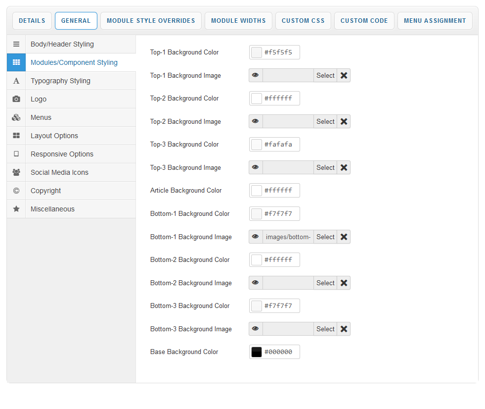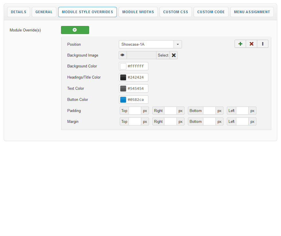 Module Style Overrides allow you to style individual module positions to your own taste. This greatly extends the control of how each of your module positions are displayed with a host of styling options including background image, background color, text color, heading color, button color and module padding. Multiple overrides can be created, each applied to the module position of your choice.