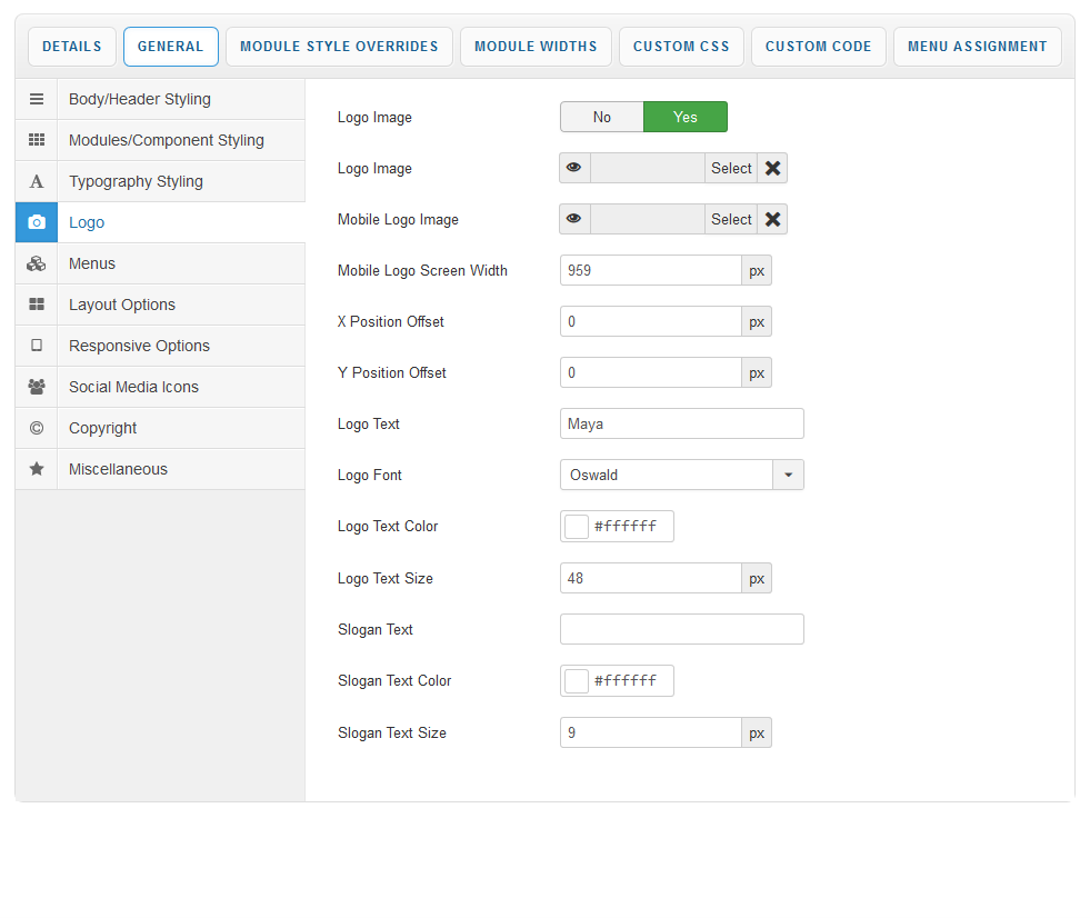 This section of the template parameters allows full control over your site logo with an array of easy to use options. Upload your logo image via the 'Select Logo Image' field and then use the X and Y axis field to tweak its position.
