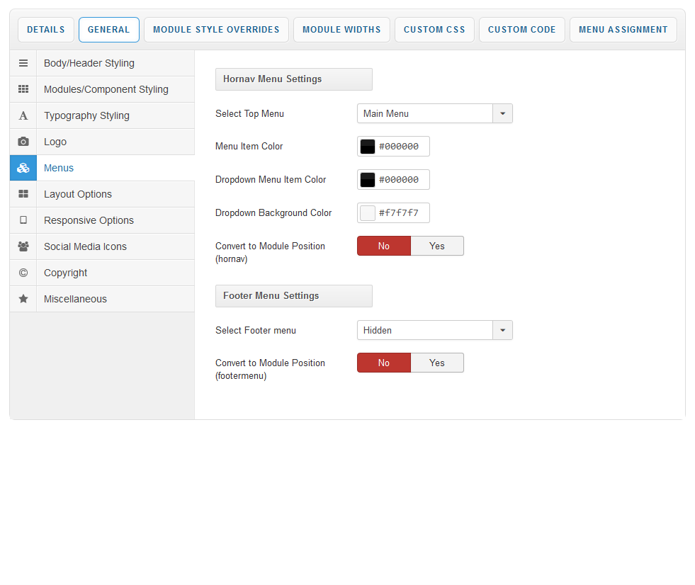 Some of the main menus of the template are now set via the template parameters saving you having to set up menu modules for each menu. From this section you can choose what menus you would like connected with these pre assigned menu areas of the template.