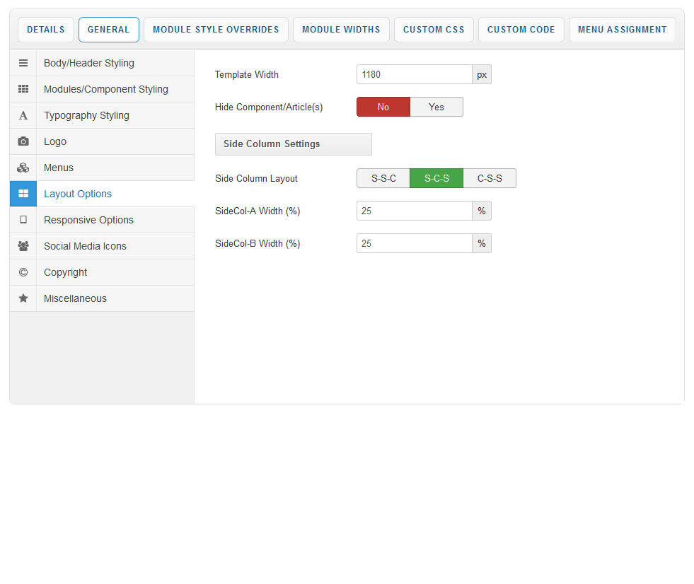 From your Layout Options you can set the layout of your side columns in relation to your site content with options for both your side columns to appear on either the left or the right or on either side of your content/component area. Width options are also available in this tab to edit the entire width of your template.